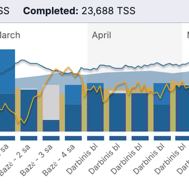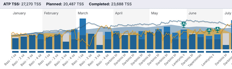 Pirmiausiai sudėliojame metinį planą. Tikslas pasiekti per metus 18-26k TSS/metus. Tikslai aukšti, treniruočių reikalavimai irgi, kitaip bus tik kojų traukimas ir jėgų trūkumas (pavyko įgyvendinti 23k/metus, planas buvo 20k TSS/metus.).