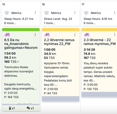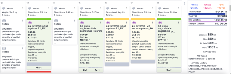 Įžvalgas tokios, kad reikia daugiau treniruoti kojas, ilgomis sunkiomis treniruotėmis, didinti atsparumą nuovargiui. Mano mėgstamiausias pasirinkimas tam buvo "Da nu na" treniruotės. 3x20min FTP, valanda tempo su pagreitėjimais po 2min ypač aukštu tempu. Galiausiai dar pakankiname su 30min tempo važiavimu. Tai buvo vienos iš key workouts.