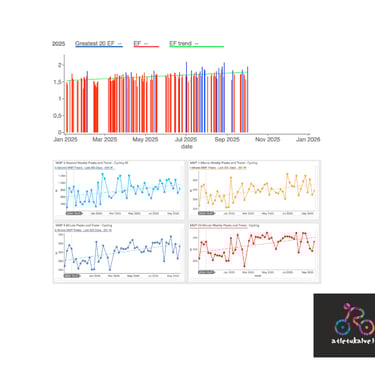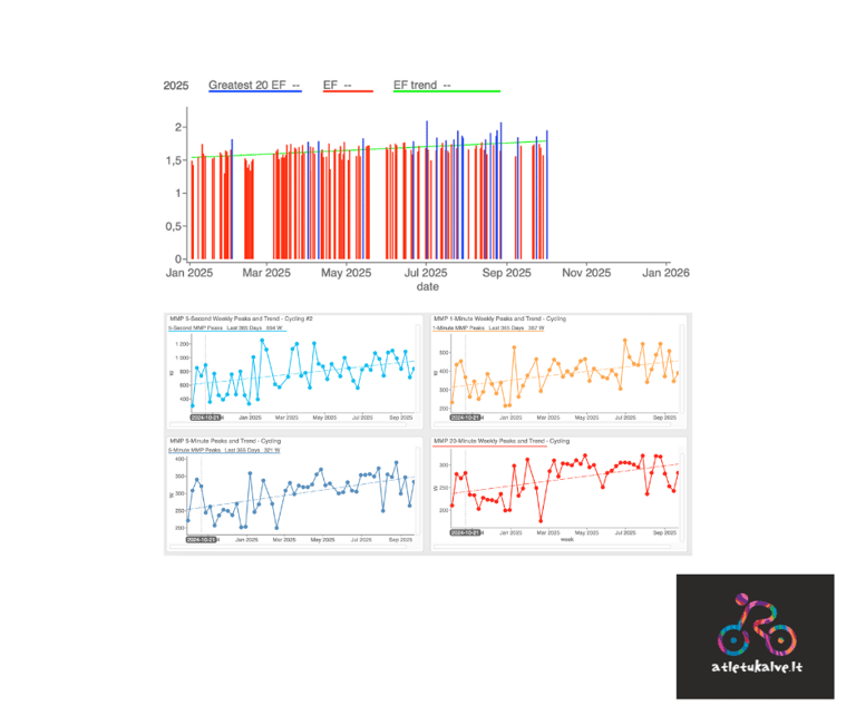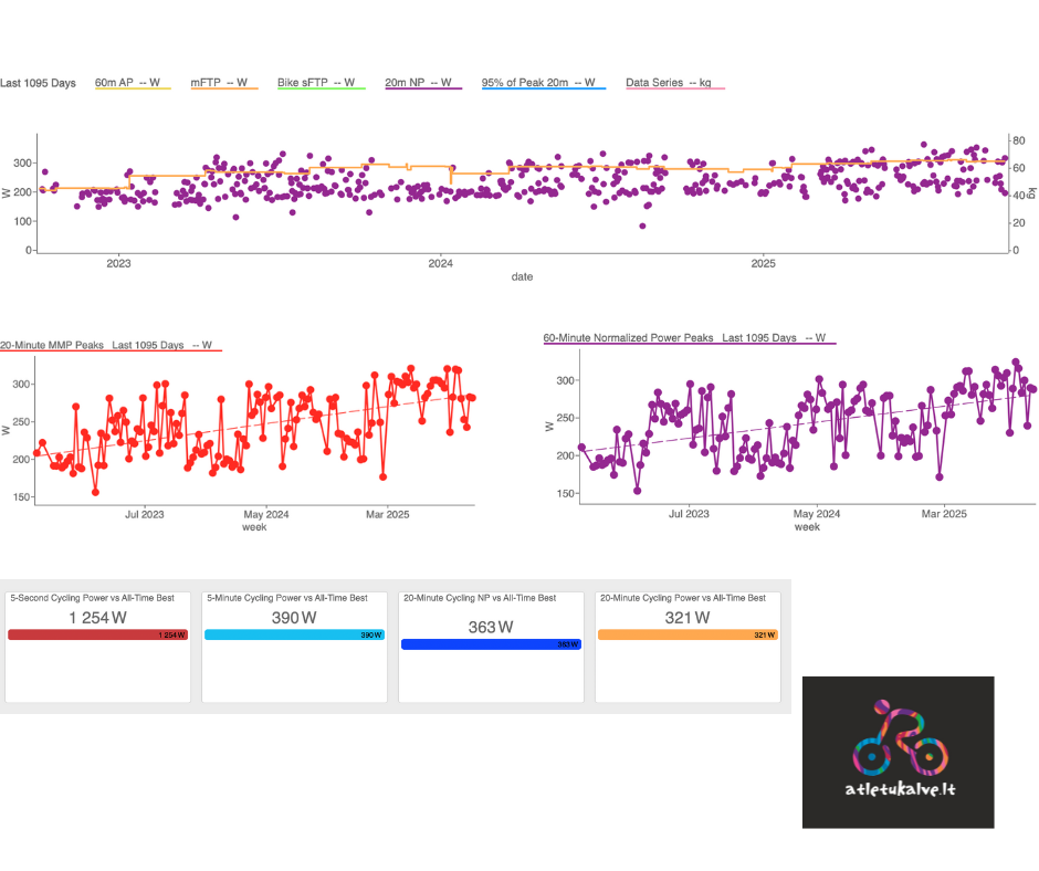 2024 buvo metai, kad pradėjome judinti proveržį. Matome, kad sportininkas turi pamatus, nedaro durnų taktinių klaidų varžybų metu, dar kiek prastokai valdo dviratį, tad laikas pradėti dar artimiau dirbti. Sportininkas išvyko į 2 sav treniruočių stovyklą Ispanijoje, daug mynė, buvo sunku, bet verta. Tai leido stipriai pasiruošti nuo pat sezono pradžios, ir važiavimai Velopeak ir MEGRE (svarbiausi metų startai) buvo geri, dar kart pagerinti W, pulsai , greičiai ir t.t. Daugybė darbo ties laktatu, norint vis labiau spausti anaerobinį pajėgumą. Sezono gale vėl tikslingas darbas su cyclocross, BFP, sunkus žiemos darbas. Visa tai davė vaisių dar kitais metais.
